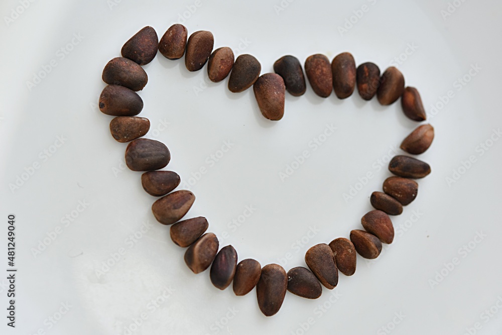 heart from unpeeled pine nut kernels on a wooden table. copy space