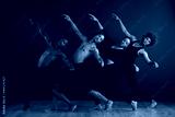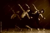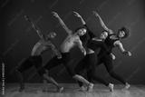 Perfectly synchronised. A group of dancers performing a dramatic pose in front of a dark background.