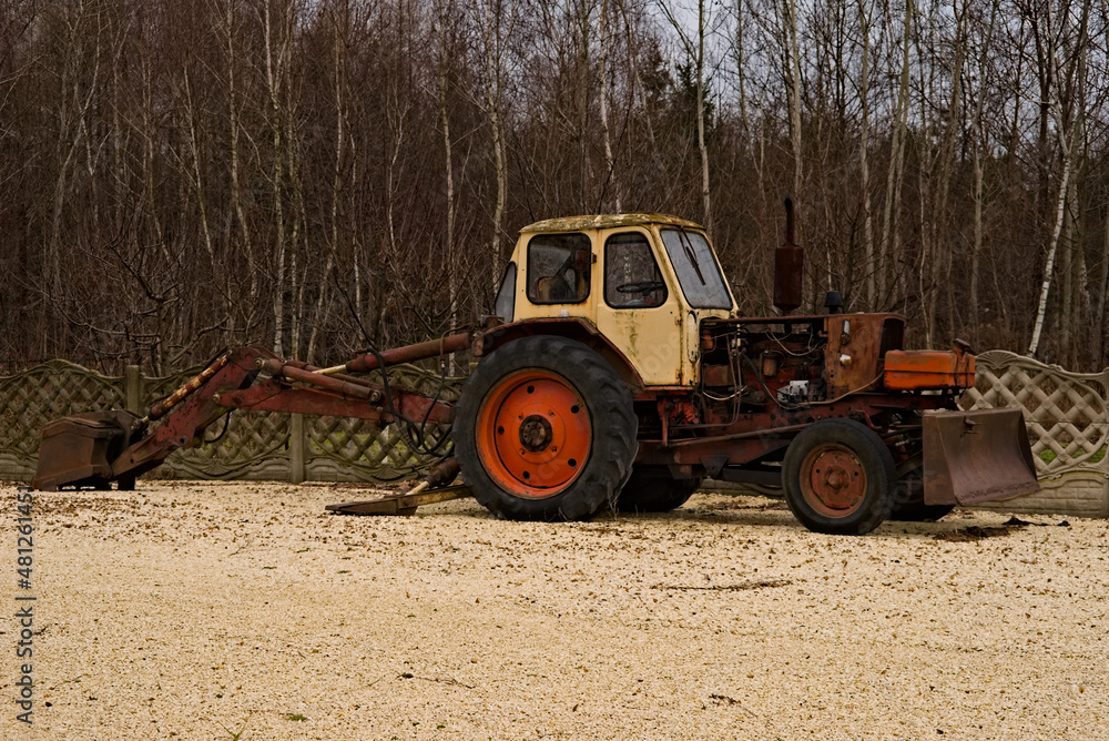 Stara, czerwona koparka -spychacz , stojąca na żwirowym podłożu . An old, red excavator - bulldozer, standing on a gravel ground.