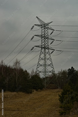 Ogromny stalowy słup elektryczny wśród lasu w pochmurny zimowy dzień . Kable , ceramiczne izolatory , las i drzewa .