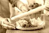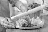 Woman putting plastic food wrap over plate of fresh fruits and berries at wooden table indoors, closeup