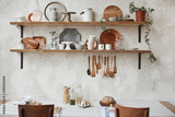 Stylish composition of cozy kitchen interior design with wooden wall shelves, wooden table, chair and kitchen utensils
