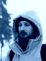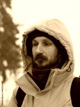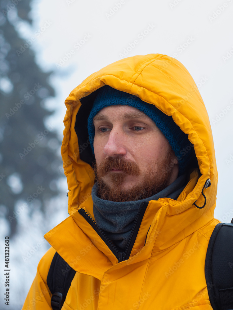 Traveler man in yellow coat with hood on blurred nature background. Authentic male tourist lifestyle portrait closeup.