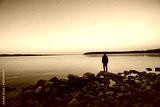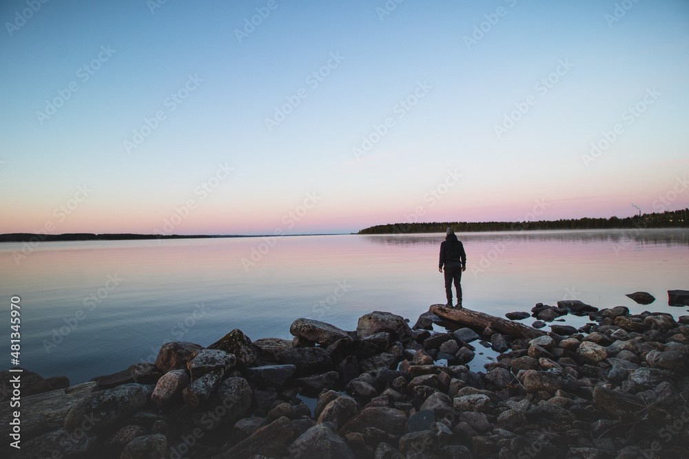 Blue-red-pink frosty sunrise at Lake Oulujarvi near the town of Paltamo in Kainuu region, Finland. An explorer in black dress enjoys the view of the calm surface of Suomi lake