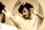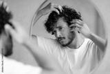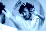 Haircare treatment. Worried indian guy looking at flaky scalp in mirror, examining gray hair and hairloss issue