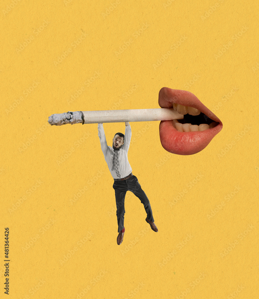 Young man balancing on smoking cigarette from woman's mouth isolated on yellow background. Contemporary art collage.