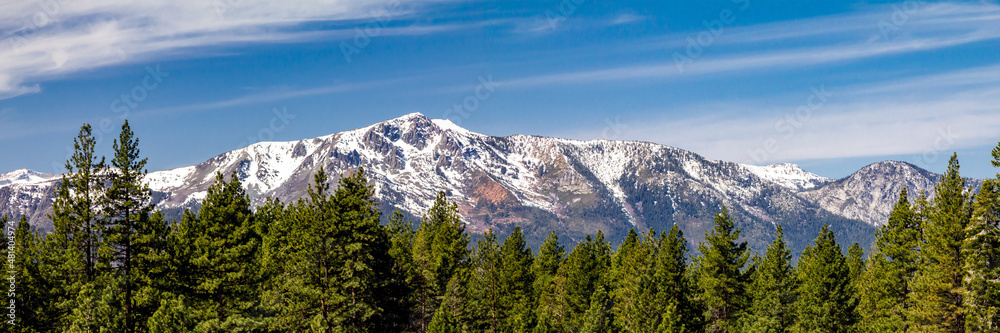 Panoramic landscape scene with snow capped mountains above an evergreen forest in Lake Tahoe California