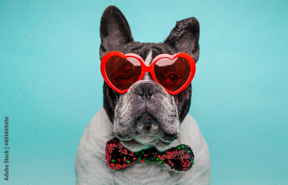 Portrait of French Bulldog with heart shaped glasses celebrating Valentine's day isolated on a blue background