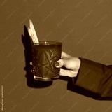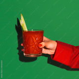 Female hand holding glass with cocktail bloody mary isolated on bright green neon background. Concept of taste, alcoholic drinks