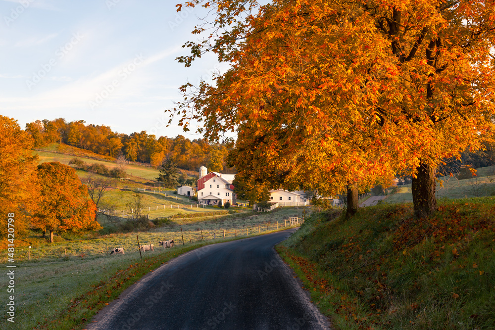 A Back Township Road in Autumn Beside a Bright Orange Tree in Ohio's Amish Country