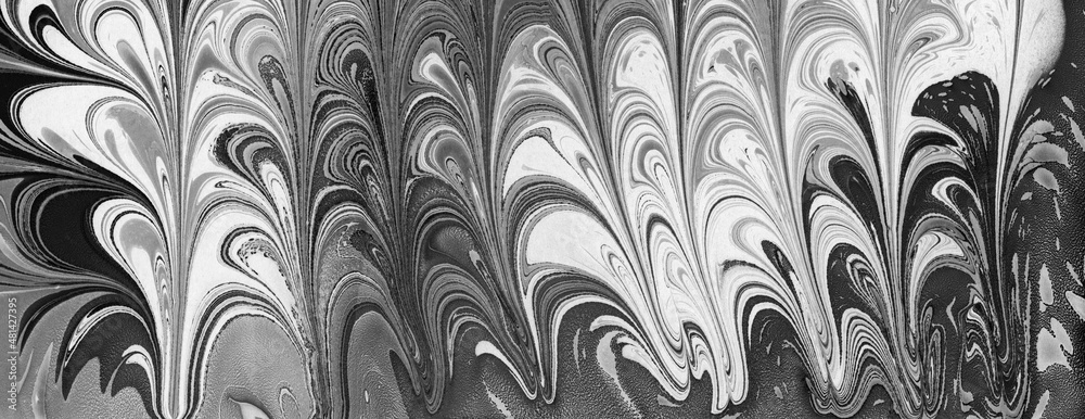 Art Abstract flow acrylic and watercolor marble blot painting. Black and white Color wave horizontal long texture background.