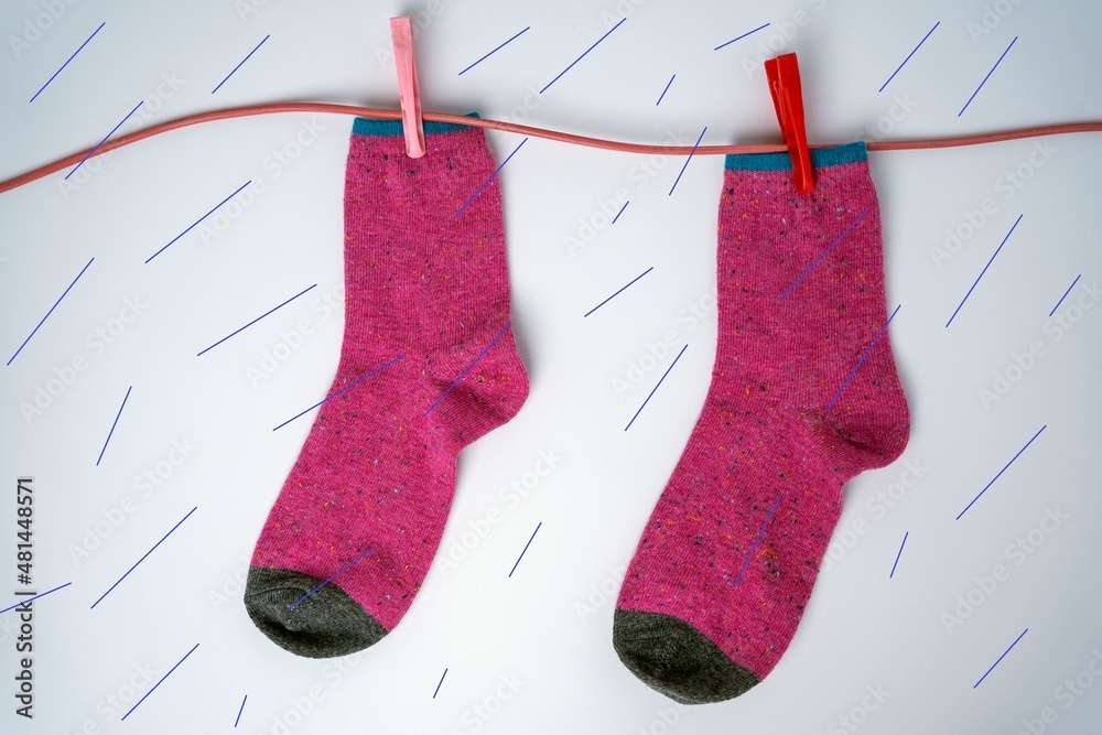 Women's crimson socks hang and dry on a clothesline during the rain. Absurdity and humor