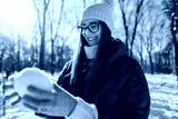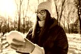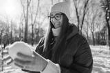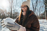 Woman making snowball outdoors on winter day