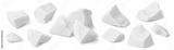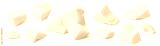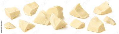 Big set of white chocolate pieces. Broken chunks isolated on white background.