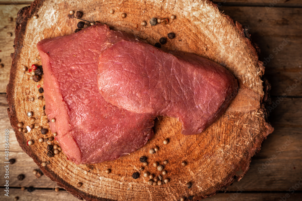 Raw game meat, beef, top view. Steaks, pieces of red meat on chopping block, wood slice. High quality roe, deer meat.