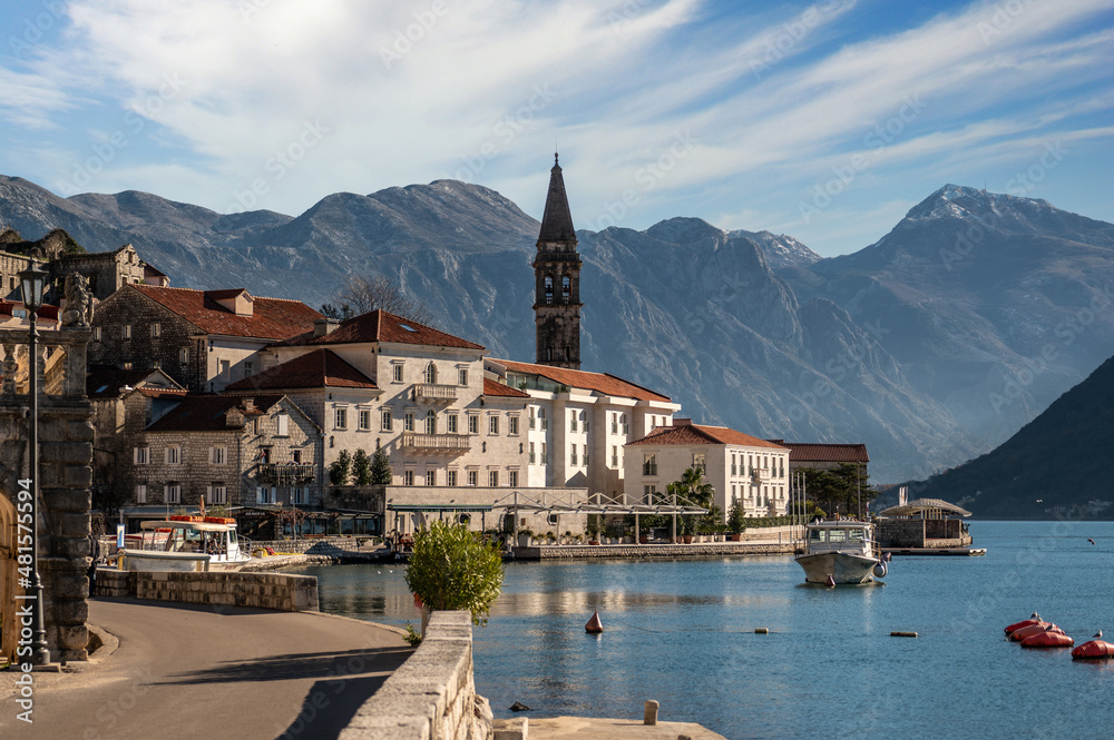 Panoramic view of town of Perast, Montenegro and bay of Kotor. Historic city of Perast in Bay of Kotor. Panoramic landscape Kotor bay in Montenegro at sunset.