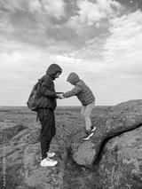 Travelers father and daughter walking climbing on mountain summit enjoying aerial view blue cloudy sky back view together. Active Lifestyle tourism Family Travel Scenic landscape hiking trail Backpack