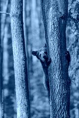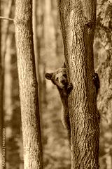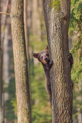 male brown bear (Ursus arctos) the cub climbs the tree and peeks out
