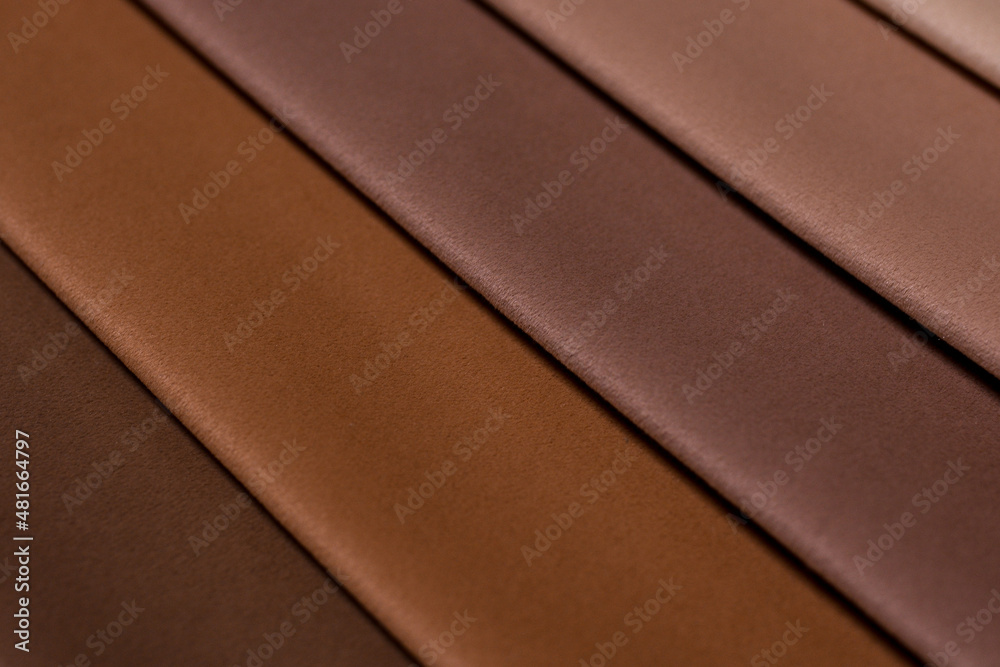 Samples of furniture fabrics.Multicolor fabric texture background.Velours.Pastel brown colors from light to dark.