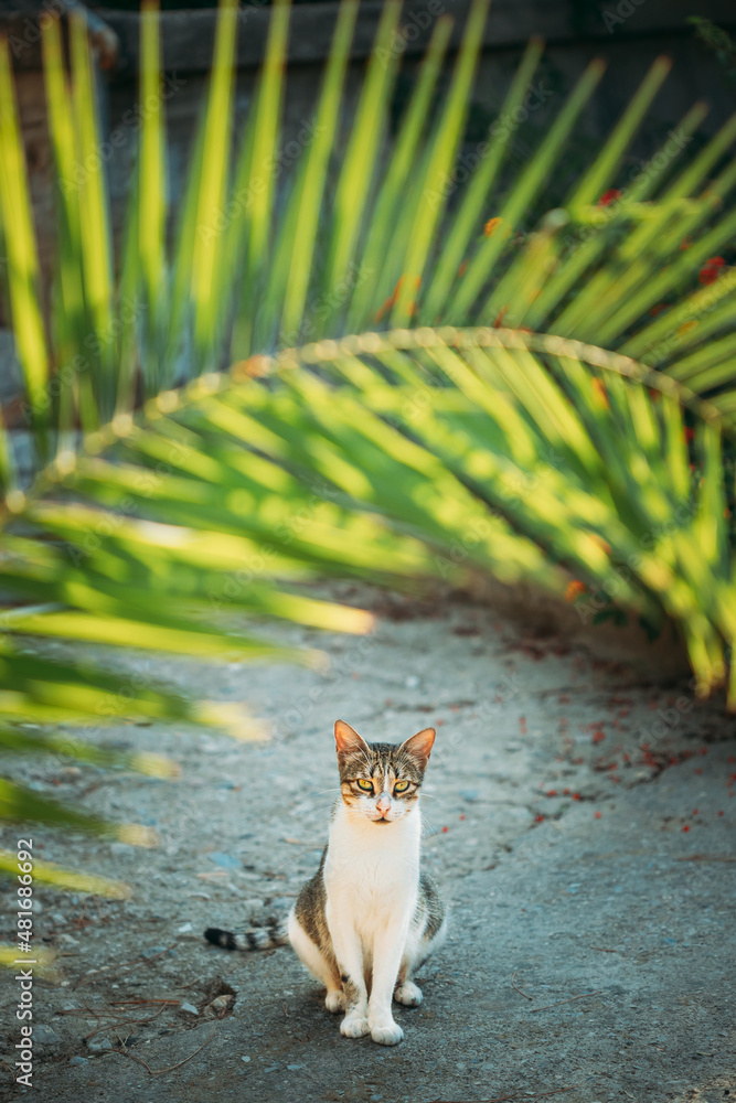 Funny Young Cat Sitting Under Palm Branches In Summer Garden. Funny Young Cat Sitting Under Palm Branches In Summer Garden.