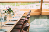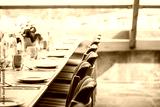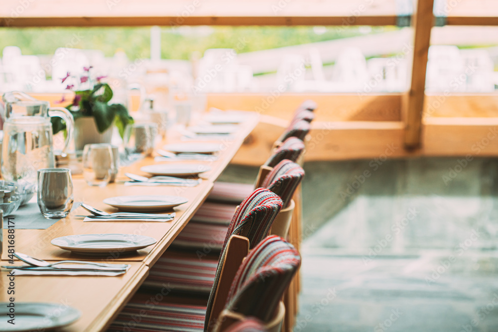 Cozy Interior Of Summer Cafe. Table And Cutlery Laid Out. Cozy Interior Of Summer Cafe. Table And Cutlery Laid Out.