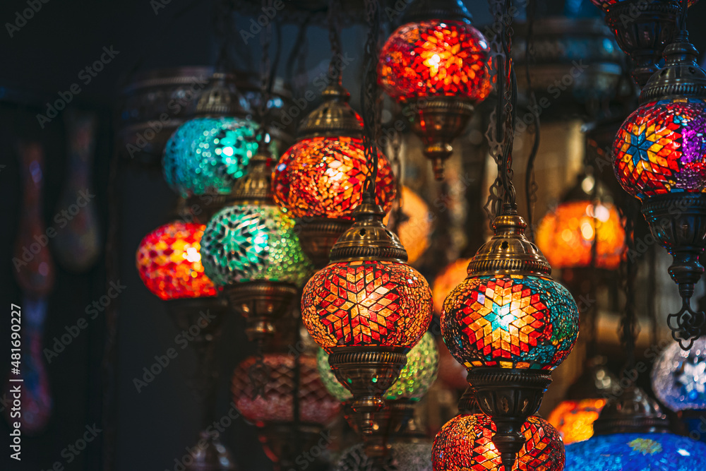 Turkey. Market With Many Traditional Colorful Handmade Turkish Lamps And Lanterns. Lanterns Hanging In Shop For Sale. Popular Souvenirs From Turkey. Turkey. Market With Many Traditional Colorful