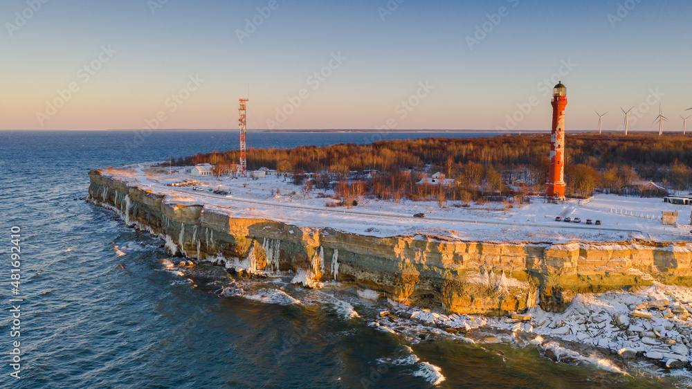 Aerial view to the winter sunset colored sea cape with lighthouse and wind turbines. The soft limestone cliff is leaking the groundwater and creating long icicles.