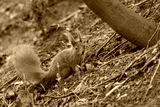 Eurasian red squirrel (Sciurus vulgaris) running around on the ground looking for food.