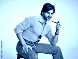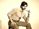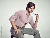 Groovy cool. A young man with 70s style sitting in the studio and smoking a pipe.