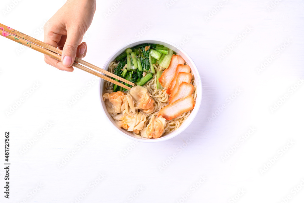 Noodles soup with wonton dumpling and grilled red pork in bowl on white background, Asian food, Top view