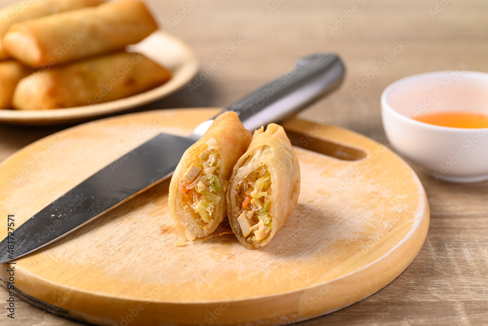 Asian deep fried spring roll filling with tofu, cabbage, carrot and glass noodle eating with dipping sauce. Vegan food
