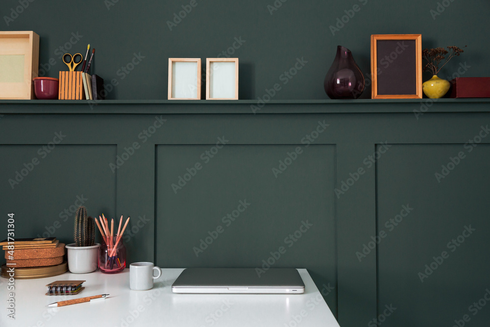 Creative desk with notebook computer, desk objects, office supplies, books, picture frames and cactus on a dark green background.