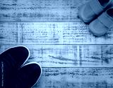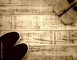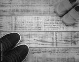 Big and small sneaker shoes on wooden background. Father's day celebration.