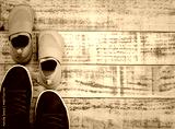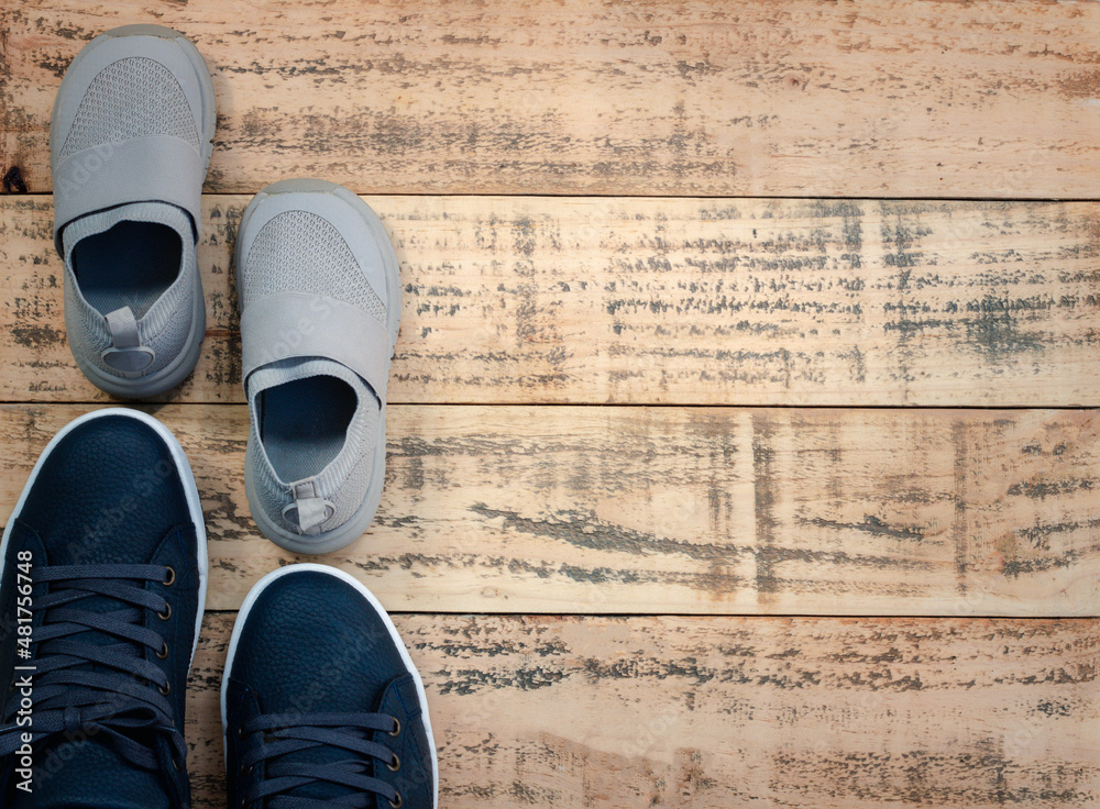 Big and small sneaker shoes on wooden background. Father's day celebration.
