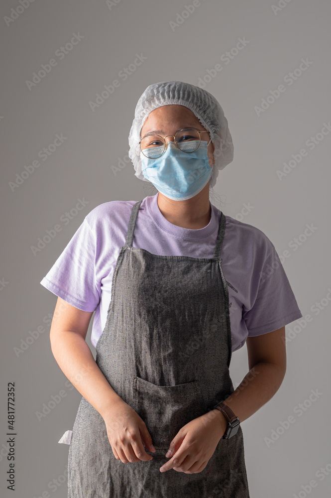 Young woman chef with blue mask in studio shot