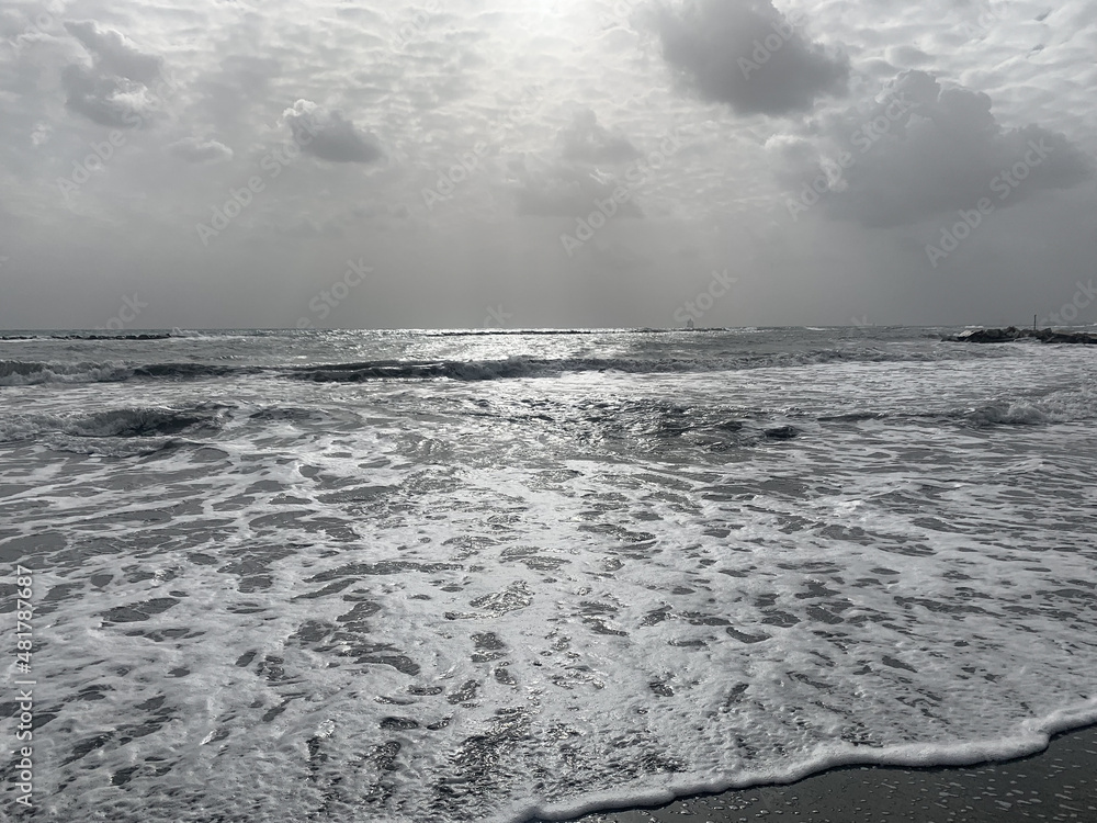 Gray and silver seascape, vivid sea horizon with silver cloudy sky