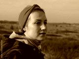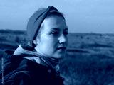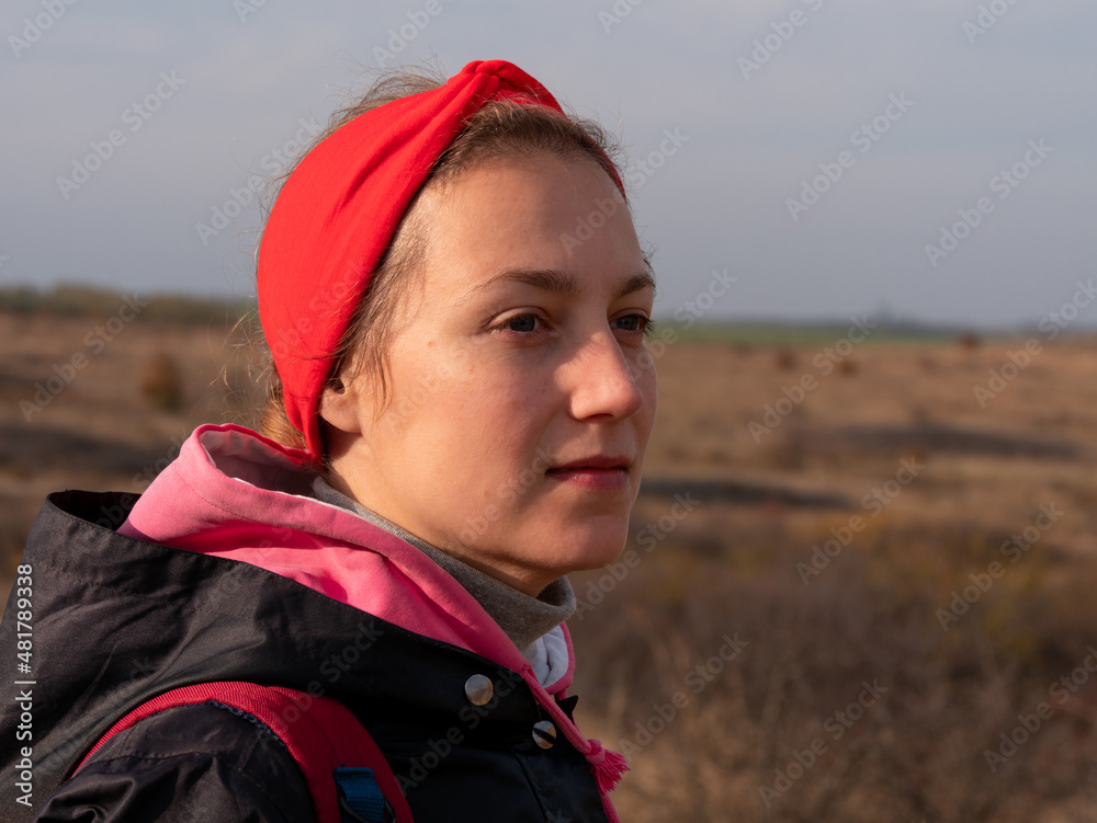 Traveler hiker woman with backpack raincoat walking on hiking trail with wild grass. Girl backpacker in red headband enjoying scenic landscape blue sky. Active healthy lifestyle tourism Solo Travel