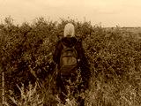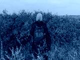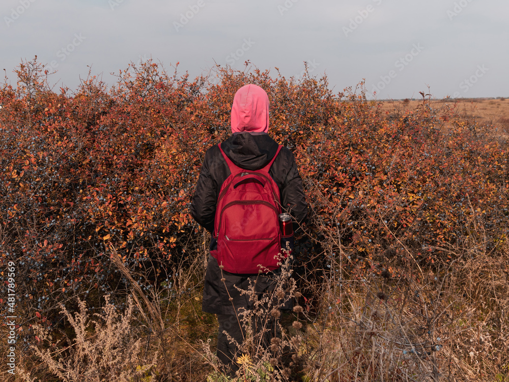 Traveler hiker woman with backpack raincoat walking on hiking trail scenic landscape blue sky. Girl backpacker in pink hood in wild sloe bushes with blue berries. Active healthy lifestyle Solo Travel.
