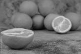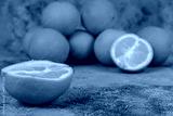 Oranges on textured blue background, side view of lots of fresh orange stack. No people.