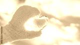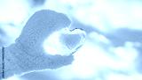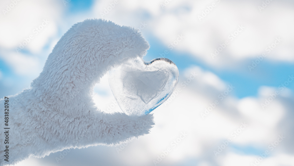frozen icy heart hand, winter background against clear blue sky and clouds, concept love, romantic, February 14, Valentine's day.