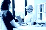 medicine, health and vaccination concept - doctor or nurse and senior woman reading medical brochure at hospital