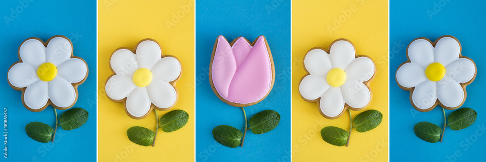 Creative collage of gingerbread in the form of flowers on the colored background. background.Top view. Spring or summer background.