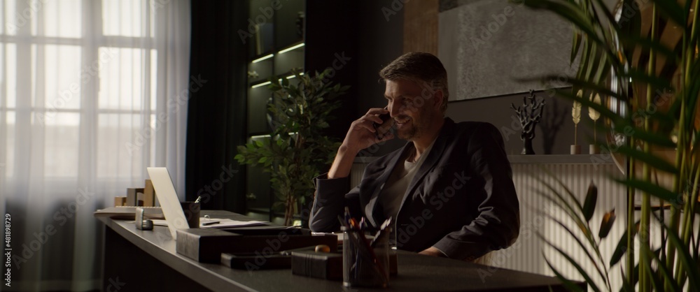 MED Portrait of 40s Caucasian businessman looking through papers while talking on the phone in his office