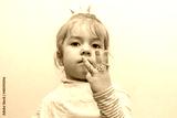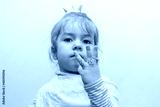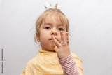A little girl in a crown shows the rings on her hands, children's jewelry and bijouterie.