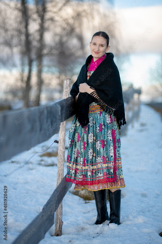 Young beautiful slovak woman in traditional dress. Slovak folklore