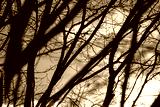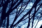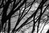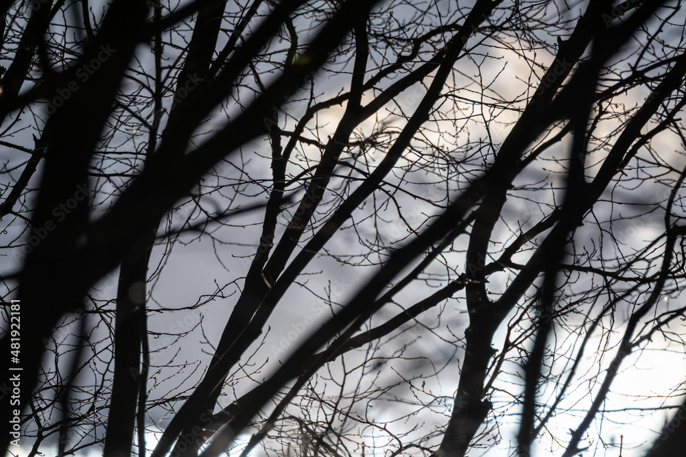 Dark bare trees branches silhouettes on cloudy epic sky view. Natural moody trees pattern view with blurry foreground. Selective focus