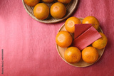 Orange fruit and red packet on red background with copy space, Chinese New Year, Lunar New Year