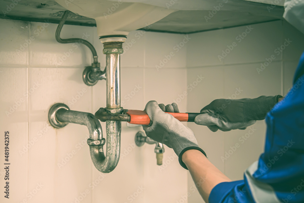 Technician plumber using a wrench to repair a water pipe under the sink. Concept of maintenance, fix water plumbing leaks, replace the kitchen sink drain, cleaning clogged pipes is dirty or rusty.