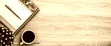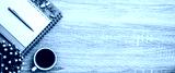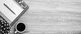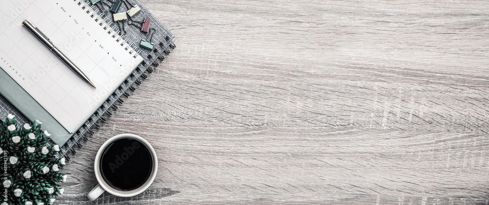 The top view desk or wooden table top and blank calendar with office equipment for working area empty and copy space composition concepts and flat lay background.