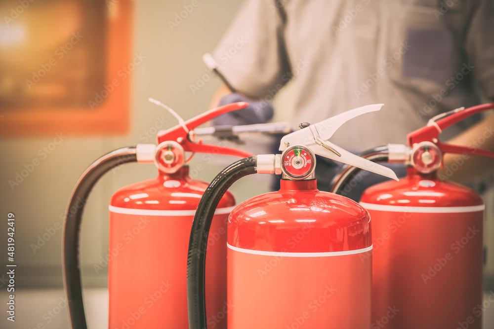 Fire extinguisher, Engineer inspection checking pressure gauge level fire extinguisher tank for protection and prevent emergency and safety rescue and fire alarm system training.
